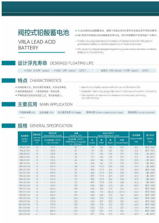 YUASA阀控式铅酸电池,凝聚了汤浅公司100多年专业电池生产经验的精华。NPL系列有多种型号电池供选择,作为可信赖的产品提供给广大客户.