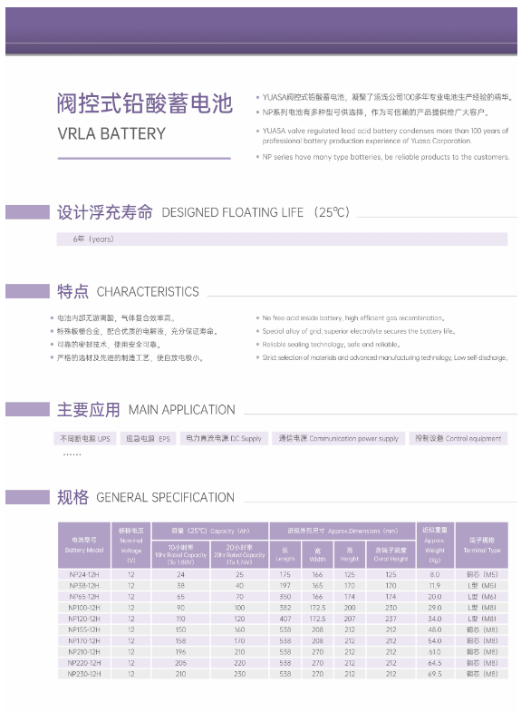 电池内部无游离酸,气体复合效率高,使用安全性高。特殊板栅合金,合适的电解液比重,充分保证寿命。极板采用双面涂膏技术,确保电池性能一致优越。汤浅经典设计,使用广泛,用户认可度极高。